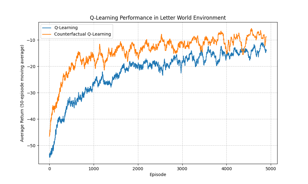When we run both algorithms on the Letter World environment, we see a significant improvement in learning efficiency with Counterfactual Q-Learning: